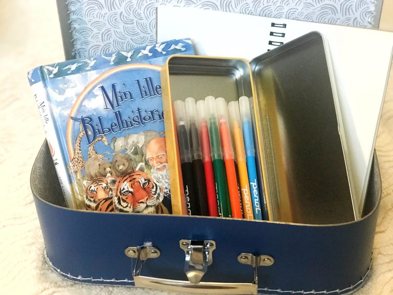 En liten koffert som inneholder skrivesaker, en Bibel og en fin skrivebok med blanke ark - slik at barna også kan tegne i den. Skriveboken kan barna bruke til å skrive ned bibelvers og lytte til Guds stemme, de kan også lime inn bilder i den eller tegne/skrive ned noe Gud viser dem. Gjennom denne julegaven kan barna våre bli inspirert til å bli bedre kjent med Jesus.